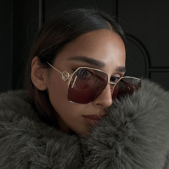 Gafas de sol cuadradas oversize en metal dorado con lente gris oscuro.