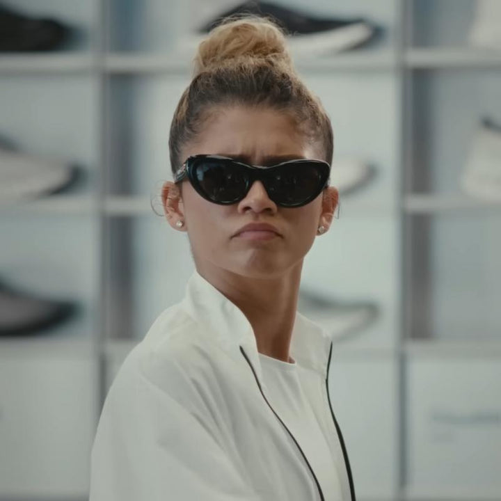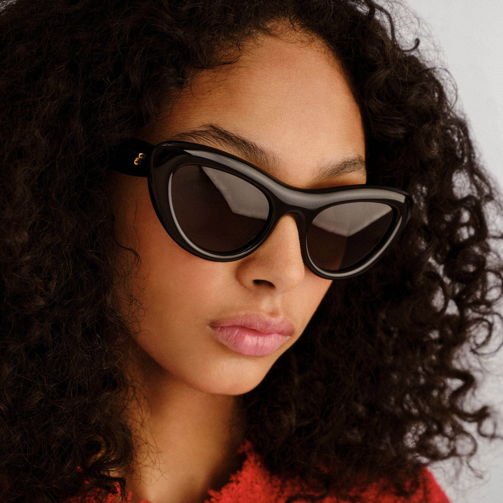 Gafas de sol tipo ojo de gato en ángulo negro con detalle de logo plateado en las patillas.