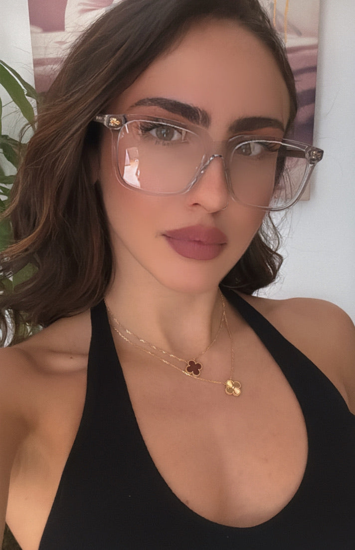 Marco cuadrado transparente con detalles dorados.