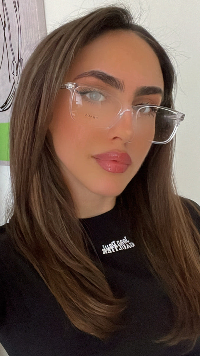 Featuring a unisex crystal clear acetate frame with demo lens.